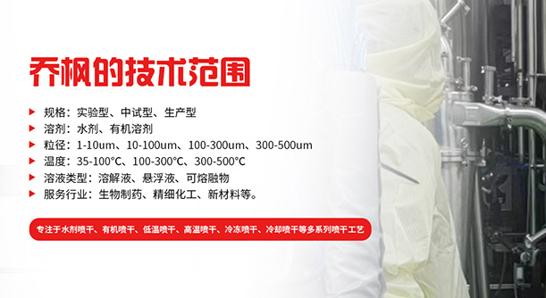 上海喬楓實業有限公司,成立于2012年,是從事噴霧干燥設備的研發(fā)設計、生產、銷售(小型噴霧干燥機實驗型噴霧干燥機35℃低溫噴霧干燥機有機溶劑噴霧干燥機低溫閉式循環(huán)噴霧干燥機超細粉末噴霧干燥機噴霧冷凍干燥機真空噴霧干燥機氣流噴霧干燥機噴霧造粒干燥機離心噴霧干燥機沸騰制粒機等)和售后于一體的綜合性公司,本公司現成為一家致力于為生物制藥、精細化工、新能源、陶瓷造粒及食品工程等領域提供全套解決方案的整線交鑰匙工程企業。
